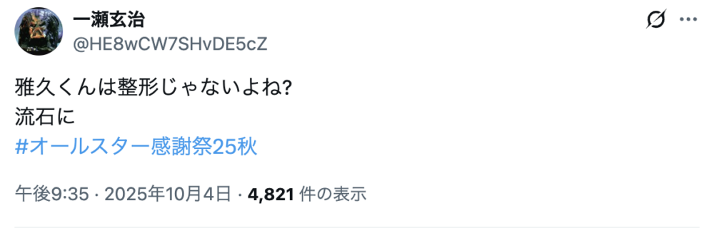 2025年10月に放送された『オールスター感謝祭’25秋』に出演したaoenの雅久さん。