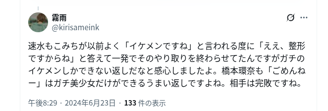 速水もこみちさんは2015年に出演したある番組で、「イケメンですね」と言われた際、「整形ですから」と答えて話題になりました。