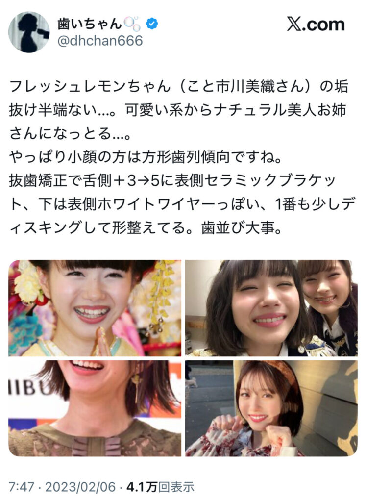 市川美織さんは「歯並びが変わり、垢抜けた」という声があるようです。
